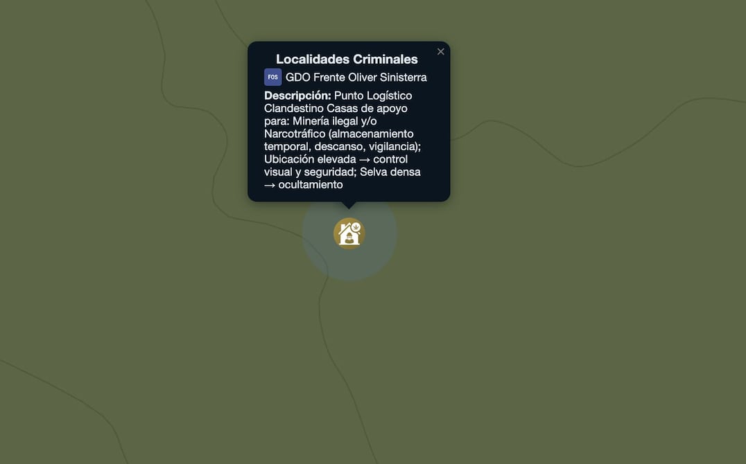 Por ejemplo, en el mapa se puede observar un punto logístico clandestino de casas de apoyo para la minería ilegal o narcotráfico, a cargo del frente Oliver Sinisterra, en la provincia de Esmeraldas, en la frontera con Colombia.