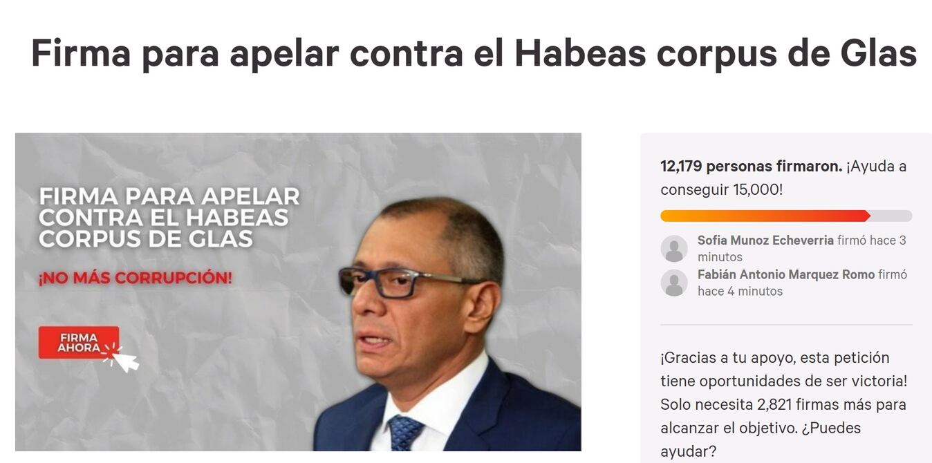 Más de 12.000 ciudadanos han firmado, hasta el momento, una petición que busca apoyar la apelación al habeas corpus concedido al exvicepresidente Jorge Glas y que le permitió salir de la cárcel ubicada en Latacunga, Cotopaxi, el pasado 10 de abril. La iniciativa se impulsa a través de la plataforma Change.org y su objetivo es reunir 15.000 firmas de respaldo.