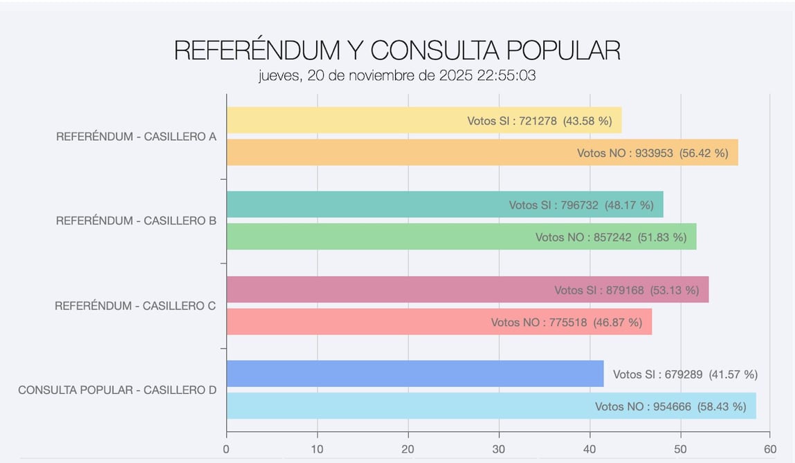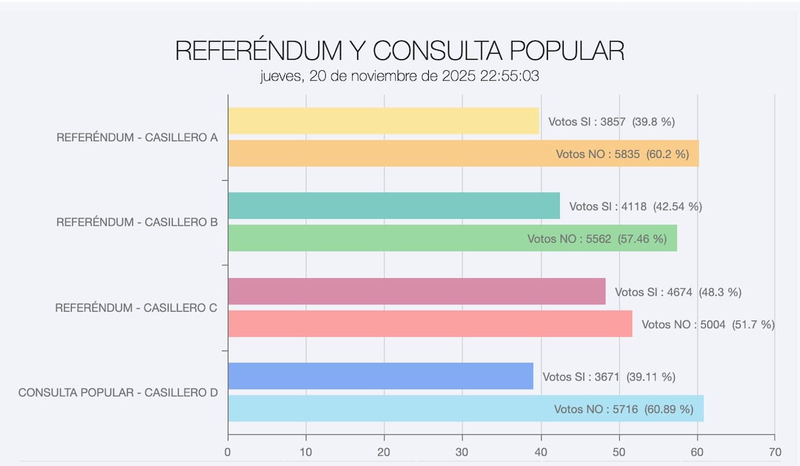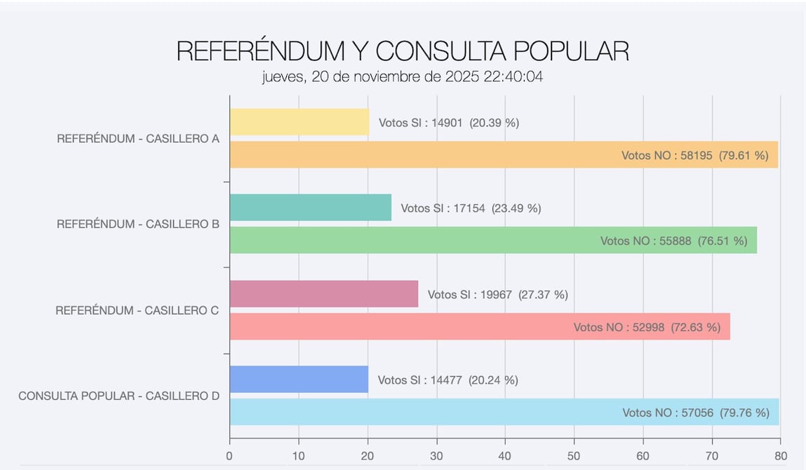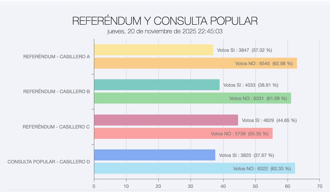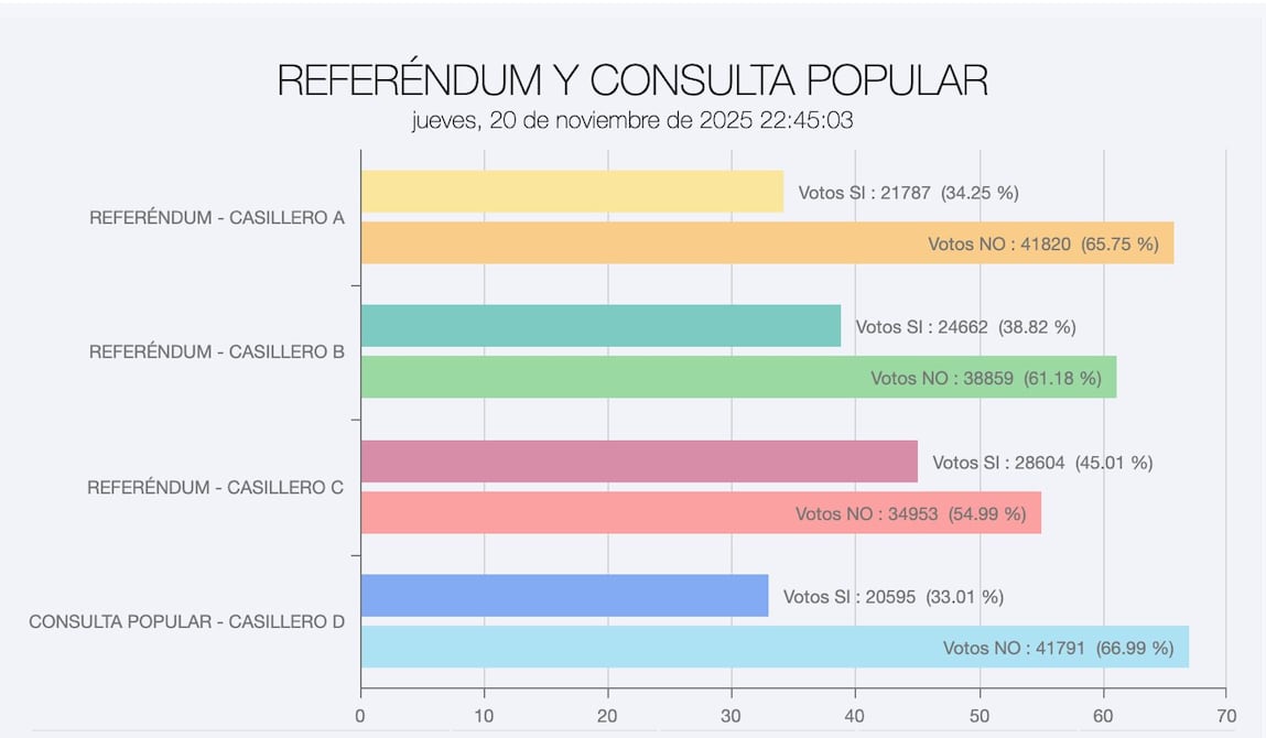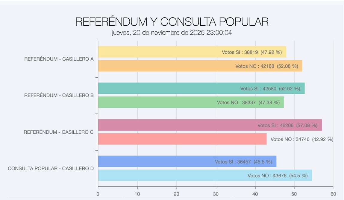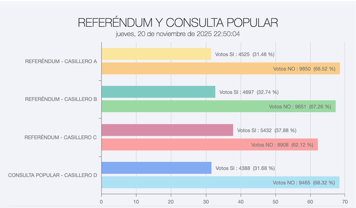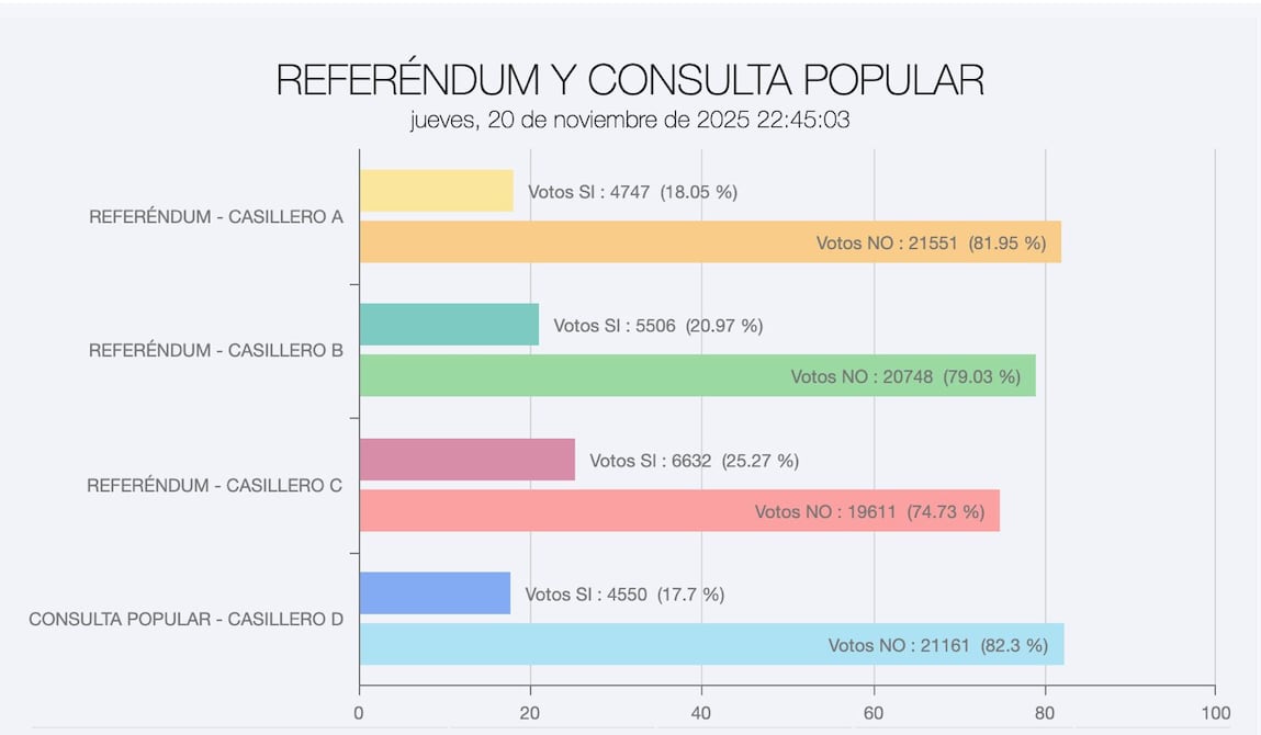 Según el escrutinio del Consejo Nacional Electoral (CNE), que ya finalizó en esta provincia, el no se impuso en las preguntas sobre el levantamiento de la prohibición de tener bases militares extranjeras, la eliminación del financiamiento del Estado a las organizaciones políticas y la propuesta para convocar a una asamblea constituyente, mientras que el sí ganó en la pregunta para reducir el número de asambleístas, con los siguientes resultados: