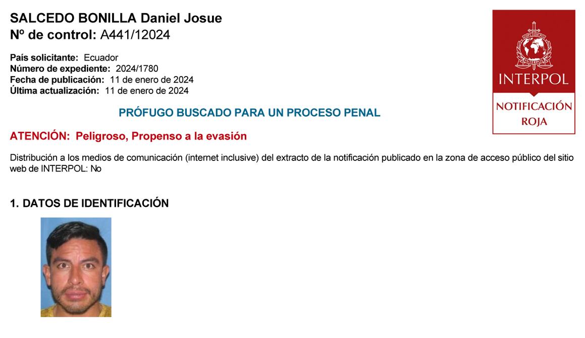 En la tarjeta roja de la Interpol (organización internacional de policía criminal) que corresponde a Daniel Salcedo Bonilla se dice que es “peligroso y propenso a la evasión”.