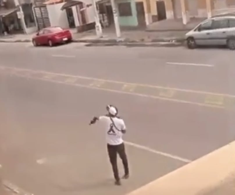 Dos hombres armados se ven en media calle como si se tratase de una película del viejo Oeste. De fondo se escuchan detonaciones y el sonido de las alarmas de carros.