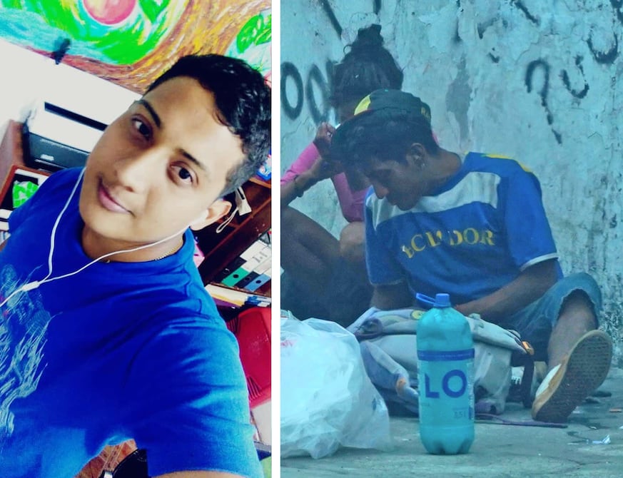 Adrián no tiene la extrema delgadez que sus compañeros, pero su rostro, sus brazos y sus piernas, ennegrecidas por el desaseo, confirman que lleva más de un año viviendo en las calles, durmiendo en veredas, rebuscando entre la basura botellas, cartones y todo lo que le sirva para canjear por droga.