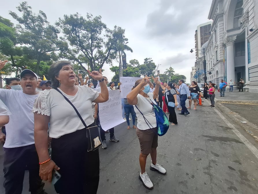 “¡No a las vacunas, no a las vacunas!”. Ese fue el grito que retumbó entre los comerciantes de la Bahía que marcharon la mañana de este lunes, 12 de mayo, por las calles del centro de Guayaquil.
