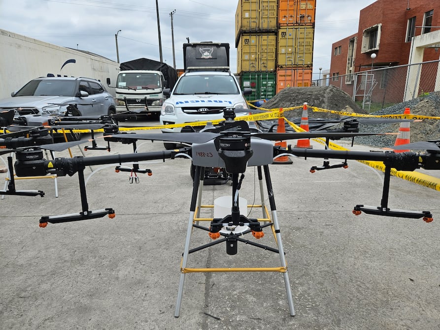 Drones de uso agrícola, pero con modificaciones que les permitían cargar hasta 30 kilos y ser operados hasta unos 5 kilómetros de distancia fueron hallados esta madrugada en una urbanización del cantón Durán, en Guayas.