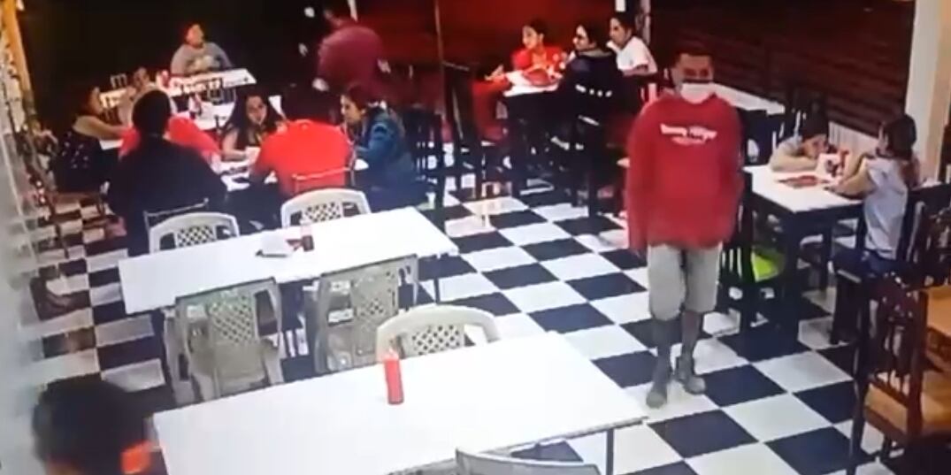 El menor que atacó a antisocial tuvo que ser contenido por otro comensal de restaurante, pues en la gráfica se observó que intentó seguir al delincuente.