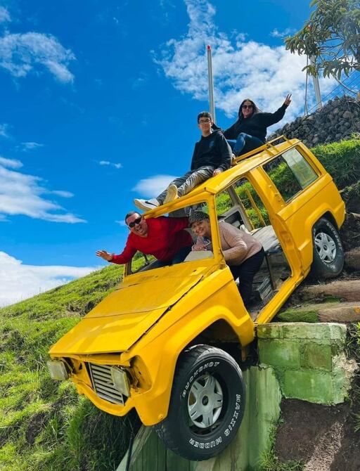 Durante el viaje, la familia se tomó una fotografía en un auto que está en posición de caer a un abismo, que es promovido como un atractivo turístico