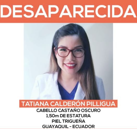 La doctora Tatiana Calderón Pilligua, quien fue reportada como desaparecida la mañana de este martes, fue hallada sin vida en un hotel ubicado en la ciudadela Kennedy, en el norte de Guayaquil. El hallazgo del cuerpo se dio a las 18:00 y por ahora se presume que se trataría de un suicidio.