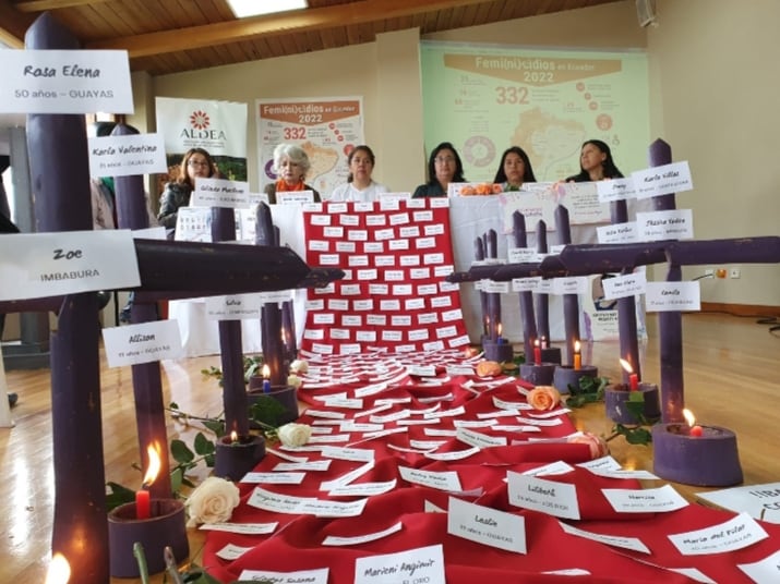 Dieciséis velas encendidas y colocadas en el piso, acompañadas de una cruz de madera y pintadas de lila, junto a rosas de diversos colores y el nombre de las mujeres víctimas de femicidio, fue la manera de representar el asesinato de mujeres en manos de sus parejas.