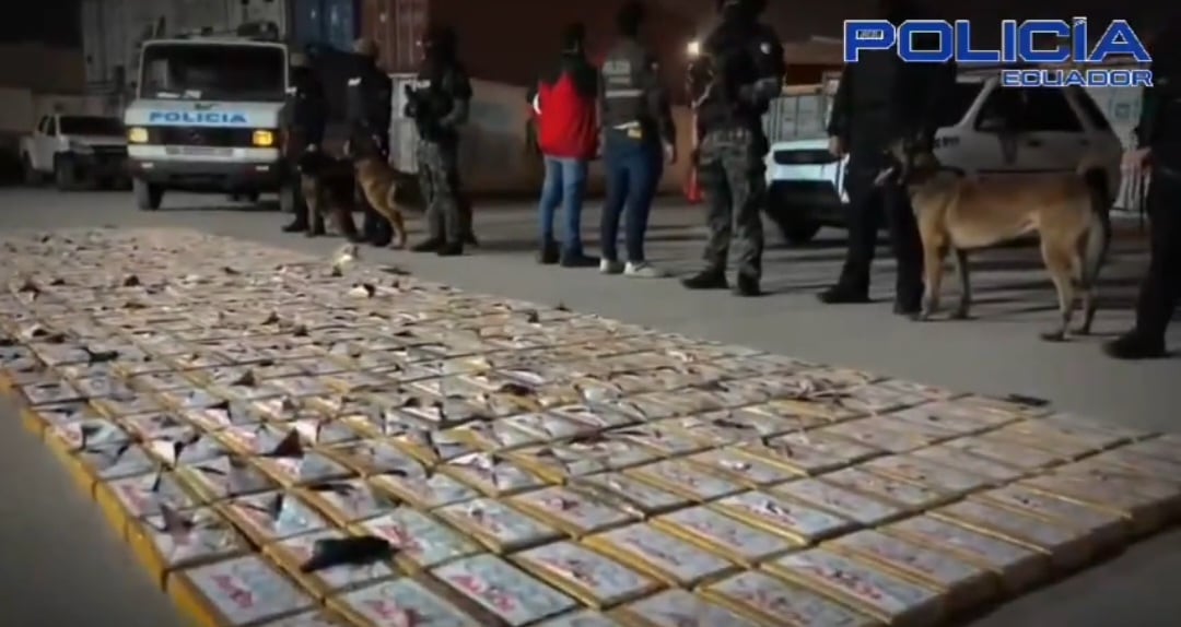 Tras una inspección a contenedores en un puerto de Guayaquil, la Policía halló 573 paquetes de droga. Con la ayuda de canes se detectó el estupefaciente.