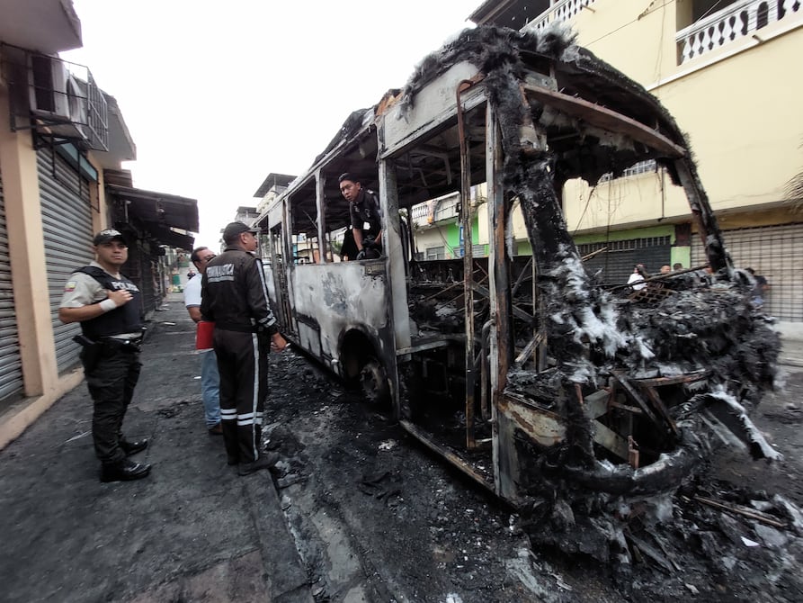 Solo restos de la carrocería quedaron de un bus urbano que fue quemado la madrugada de este martes en el bloque 1 de Bastión Popular, en el norte de Guayaquil.