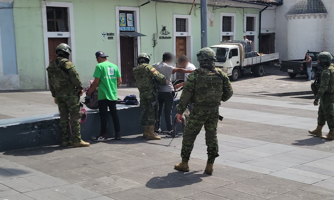 Seis militares recorren el bulevar de la avenida 24 de Mayo, en el centro de Quito, una zona considerada de riesgo, antes del mediodía de este miércoles.