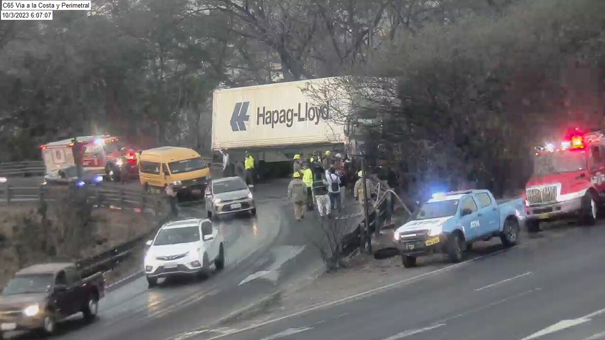 Cerca de las 05:00 de este martes, un tráiler que circulaba por una oreja vial ubicada entre la vía a la costa y la Perimetral terminó estrellado contra las barandas.