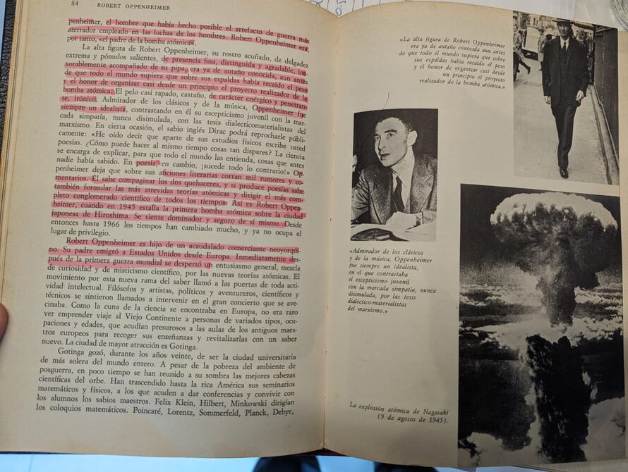 Te conocí en el 92 mientras, obligado por un trabajo de investigación de la escuela, navegaba por las páginas del Tomo 9 de la colección Forjadores del mundo contemporáneo (Ed. Planeta, 1985), que mis padres tenían en sus estanterías. Ahí vi por primera vez tu cara y tu nombre: Robert Oppenheimer. Tu fotografía estaba junto a una de la explosión en Nagasaki. Debo confesarte que mi primera impresión fue la de un científico demente y villano por ser la persona que había inventado el horror de la bomba atómica.