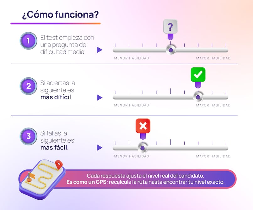De acuerdo con Giovanni Ramírez, máster en Digital Marketing, Growth Hacking y E-commerce, de Evaluar.com, plataforma en línea especializada en herramientas de gestión de recursos humanos, el CAT utiliza un algoritmo avanzado que selecciona las preguntas de un banco equilibrado de ítems. Cuando el evaluado responde correctamente, el sistema ofrece una pregunta de mayor dificultad; si falla, presenta una más sencilla.