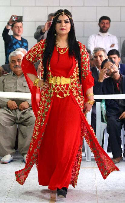 Con un vestido irisado, Efin Hisu avanza por la pasarela al son de la música en el primer desfile de moda kurda de Siria, un escaparate del renacimiento de estas prendas tradicionales.