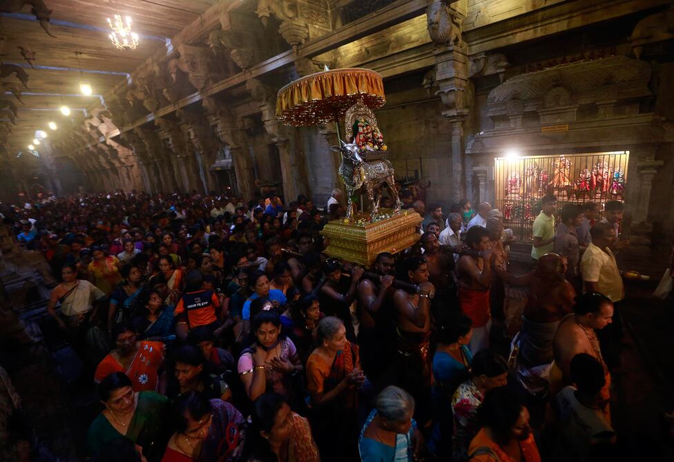 Los devotos hindúes de Sri Lanka rezaron mientras llevaban el pasado jueves una estatua del dios Shiva durante el festival anual de Maha Shivaratri en Shivam Kovil en Colombo.