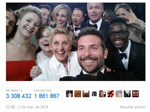 La autofoto de Ellen DeGeneres rodeada de estrellas durante la 86 edición de los Óscar ha superado los 3 millones de retuits, un récord celebrado por Samsung, la marca del teléfono con el que captó la instantánea, donando 3 millones de dólares a causas benéficas.