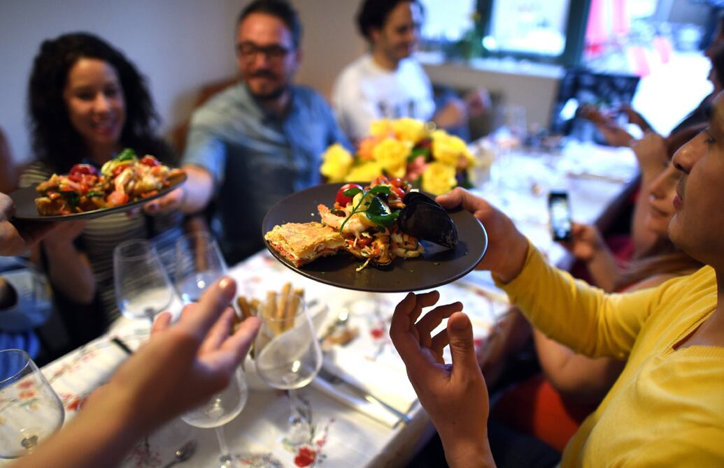 Giuseppe Marrone explica a los comensales cómo preparar perfectos ñoquis mientras beben un cóctel en su departamento de Nueva York, que por esa noche de domingo transformó en algo parecido a un restaurante.