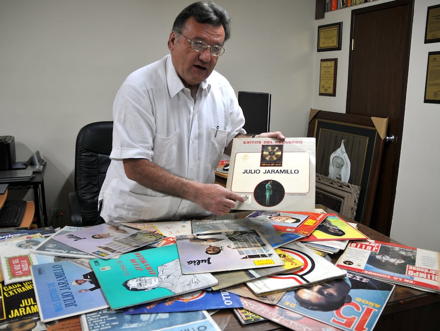 La oficina de Alfredo Enderica es una oficina de arquitecto, pero parece un minimuseo de Julio Jaramillo. Hay un colorido cuadro de perfil de JJ y las paredes están llenas de discos del cantante. Esos discos tienen su historia, como haber dejado un caro reloj de prenda para que nadie más se lo lleve, o viajar por los países que visitó JJ para conseguirlos.