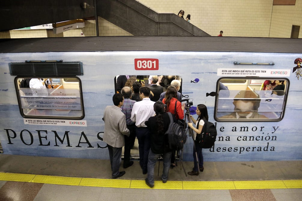 El Metro de Santiago rememora desde el pasado viernes el 91º aniversario de la publicación de Veinte poemas de amor y una canción desesperada, de Pablo Neruda, con una instalación artística en uno de los trenes que recorre la capital.