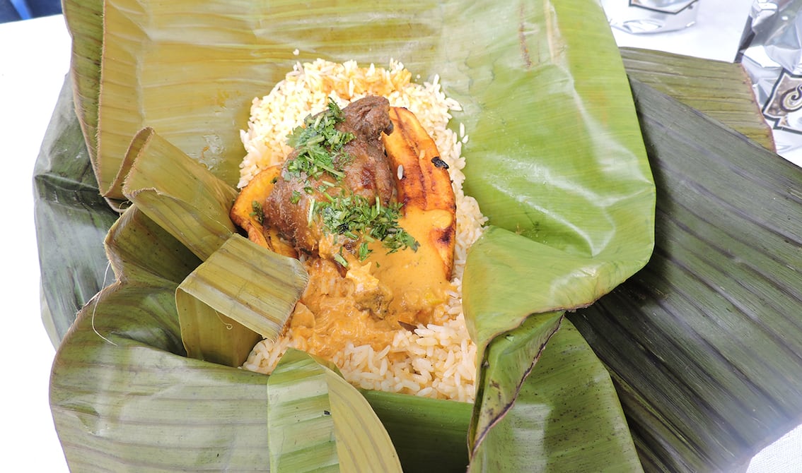 “Está hecha con amor y mucho cariño”. Así resumió María García, habitante de la parroquia Alajuela de Portoviejo, a la elaboración de la tonga, un potaje que combina arroz, maní, presas de gallina criolla y maduro. Todo envuelto con hojas de plátano tiernas y amarradas con zapán, un tejido sacado del tallo seco de esa misma planta.