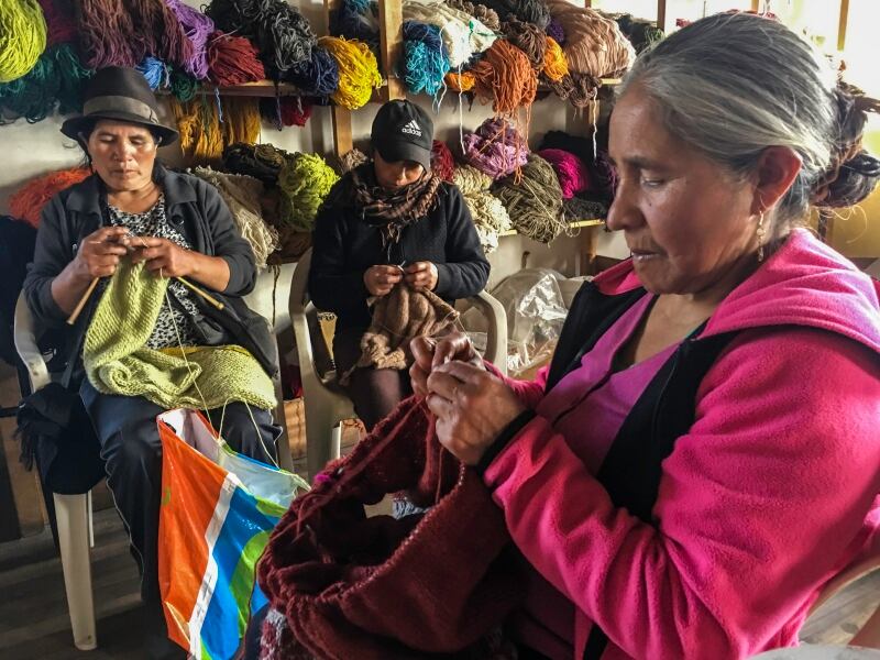 Cuatro mujeres tejen con habilidad bufandas, chalinas y gorros en una habitación llena de coloridos ovillos de lanas. Otras dos han llegado a revisar figurines para sacar modelos de abrigos con diseños andinos.