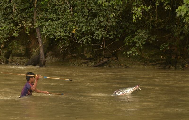 Enormes figuras oscuras sobresalen del agua, parecen fósiles de criaturas prehistóricas. Sin embargo, a medida que la canoa se aproxima, se descubre que se trata de árboles muertos a lo largo del río Bobonaza. Sus aguas oscuras se extienden, selva adentro, como una gigantesca boa convirtiéndose en la ruta fluvial para llegar, en canoa, a la comunidad Sarayaku, en la provincia de Pastaza.